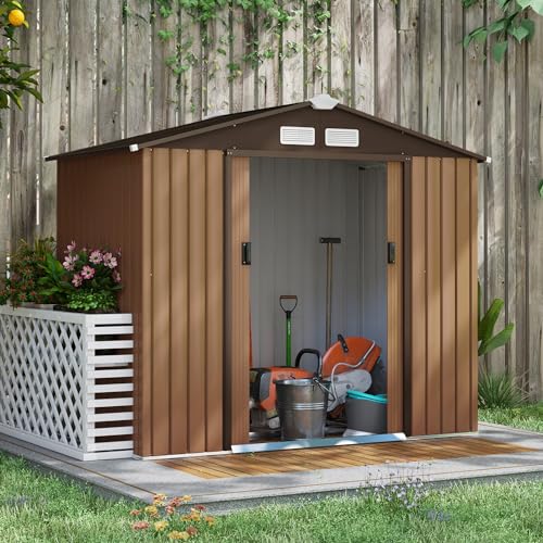 Elegant tuinhuisje: tuinhuisje van zeer elegant kaki golfplaatstaal. Het schuine en geribbelde dakontwerp van ons tuinhuis voorkomt overmatige ophoping van regenwater, beschermt zo tegen beschadigingen en garandeert duurzaamheid door de seizoenen