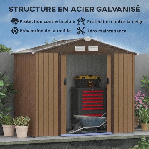 Hoogwaardige materialen: plaatstalen frame met robuust verzinkt stalen frame: duurzaam gebruik – ventilatieroosters voor en achter: optimale ventilatie; terwijl de fundering is gemaakt van verzinkt staal, wat de beschutting beschermt tegen insecten, zon en regen; de staaldikte van 0,25 mm van ons gereedschapshuis is dikker dan conventionele tuinhuisjes